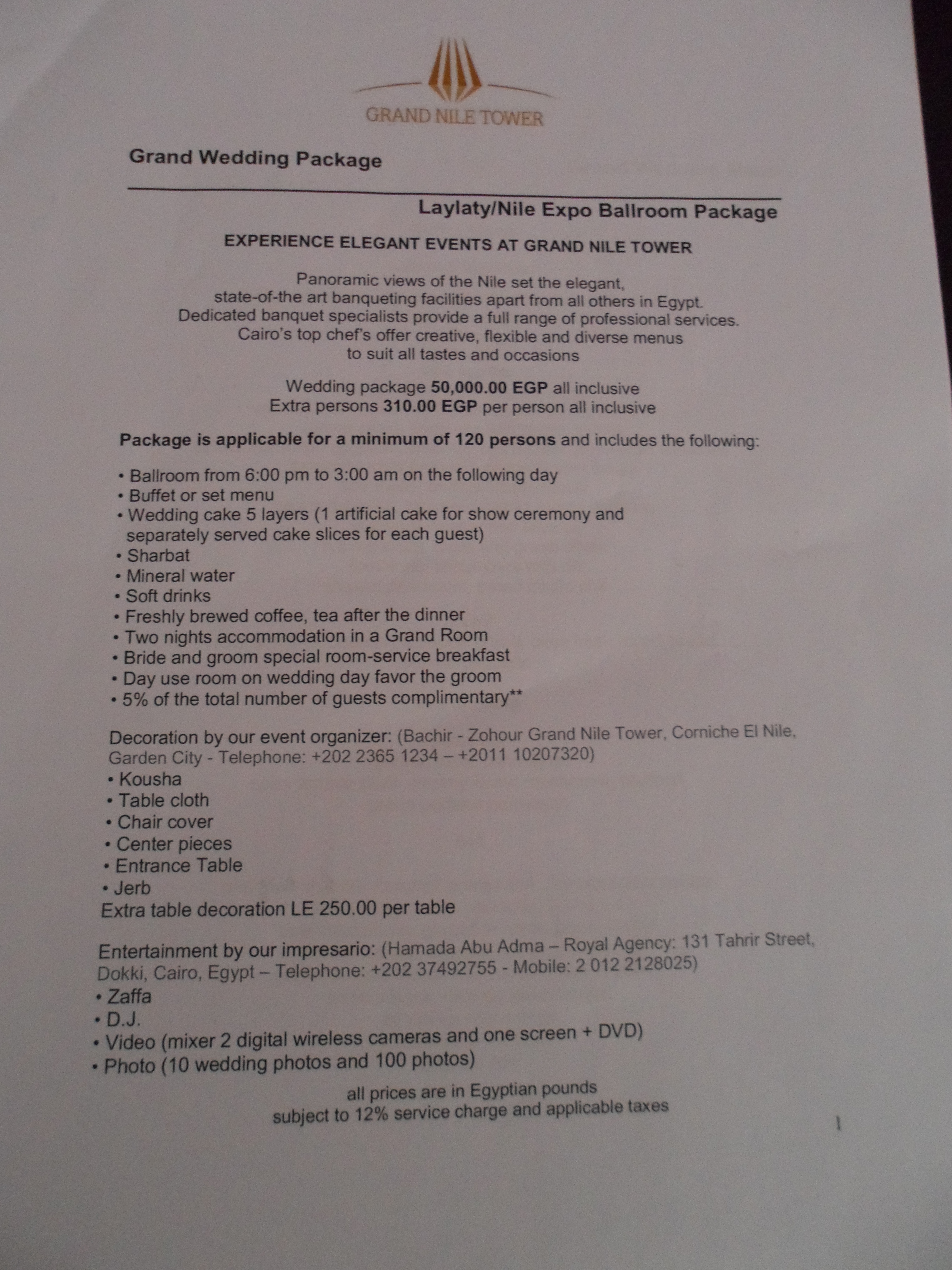 1. Hey Christina.. Thank you so much for reading my blog, im glad u liked it! Yeah I still have all the information. The only problem is that most of the prices and packages have probably changed. A friend recently checked out the Grand Hyatt hotel and the price had increased by 10000LE. But of course I have all the event managers numbers and info if you would like that?! And depending on our budget the hotels offer different packages… Id love to help you with anything you need… I couldnt even imagine planning a wedding in Egypt through my husbands family, it would be a disaster! And remember this is your day, so you want it to go your way, right? 🙂 We had our wedding at the renaissance hotel in mirage city… Beautiful for a small wedding, but like most Egyptians they dont listen nor deliver what you ask and pay for! Let me know how i can help and id be more than happy to send u some info! Kristine