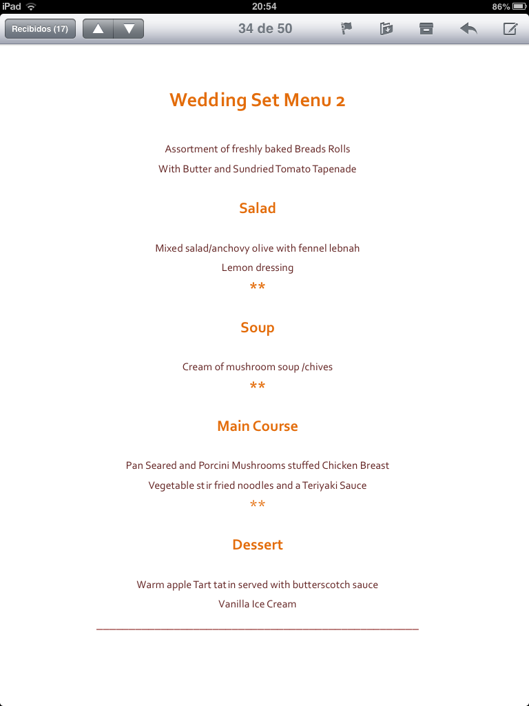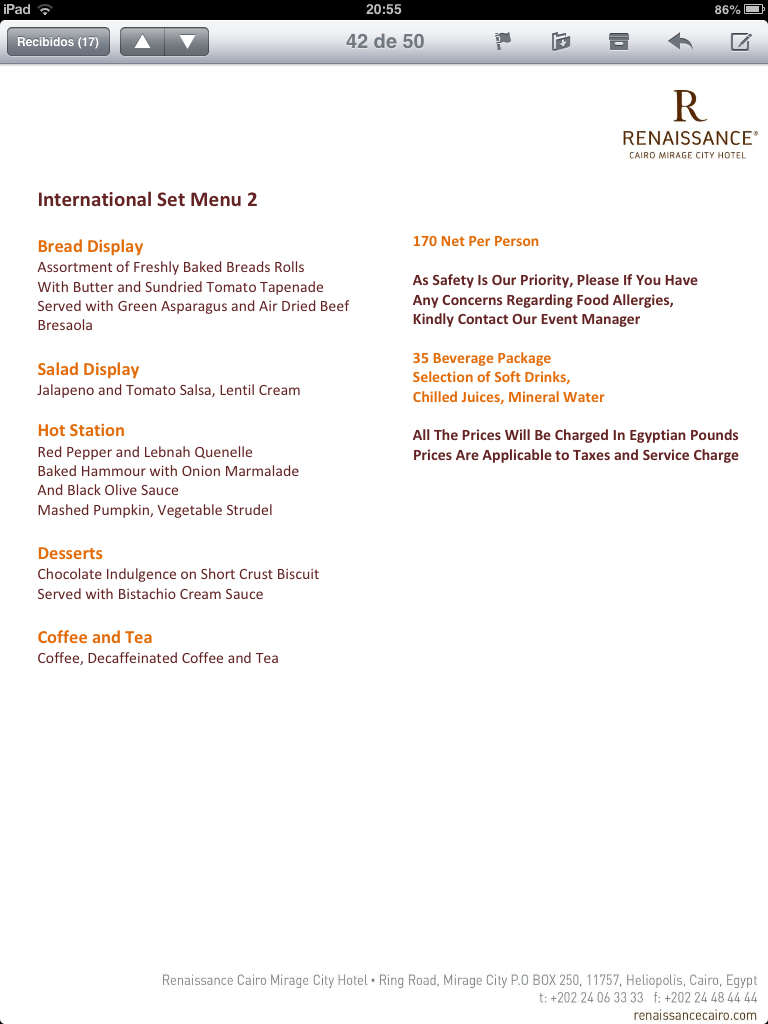 So we finally got the menus from the hotel we are having the wedding at. Seven different 3 course menus. Looked fine from a distance (laptop in the living room and me in the kitchen, about 10 meters).. Then I noticed the menus had PRICES! WHAT??!? We had been quoted a price for a 3 course menu of good quality… We were paying about 9000 LE extra JUST to change from a buffet menu to a set meal… It should be cheaper with a set menu than buffet, ALOT less food, but lets not get into this discussion again.. I hate buffet with a passion. I hate people who are not experienced waiters carrying food… I hate people behaving like animals.. As soon as a buffet is set up people act like they have not eaten for days, will not eat for another week, and are trying to get their moneys worth when they havent paid a cent… The only thing I had my heart TOTALLY set on was a sit down set-menu. Let the professionals do the food carrying… I do not want to step in mashed potatoes and have fried onion spilt on my dress… So yeah we got these menus that had prices, which were 1/3 of the price we were quoted. They also had titles such as ‘hot station’ and ‘salad display’. This means that one has to get up out of his/her seat and check out a station or display. This is not a sit down set-menu as was discussed.